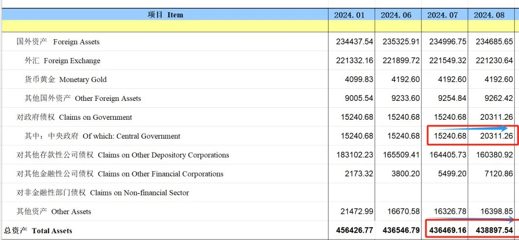 在央妈8月份最新的资产负债表里,其中“对中央政府债权”环比7月增加5070亿!