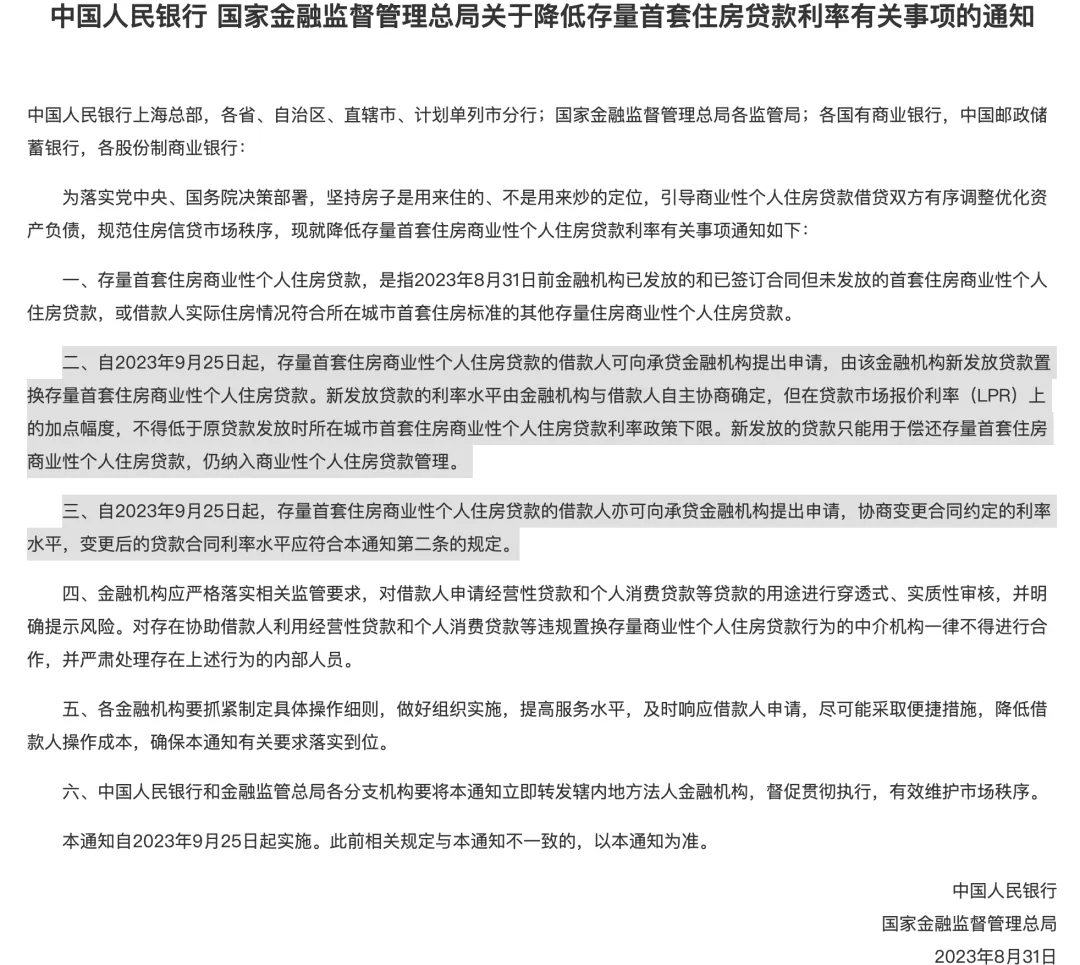 去年8月31日央行就发过一则通知,从2023年9月25日起,买家可以和银行协商加点幅度,最低可以协商到LPR+0基点,即按照LPR来还。