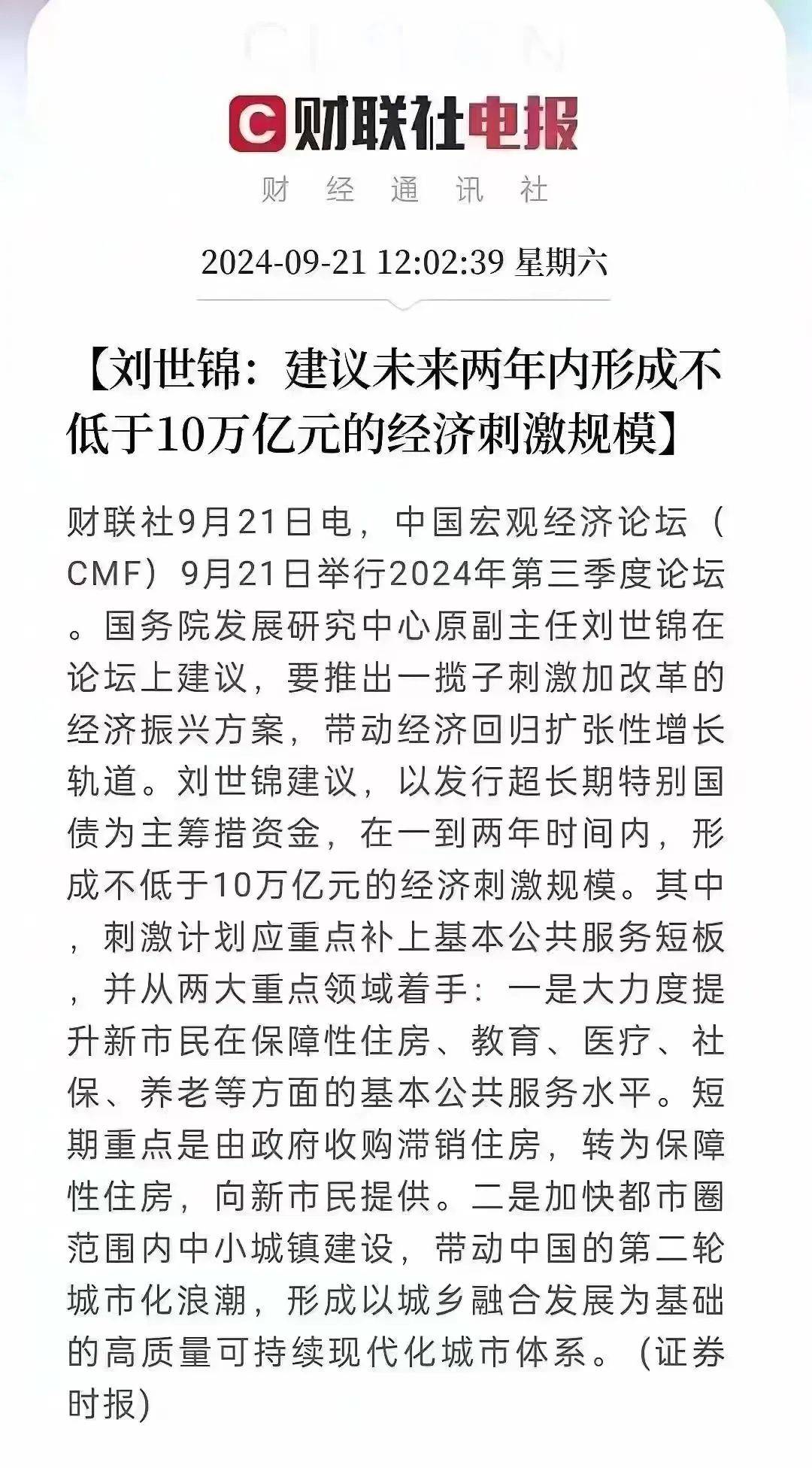 这也是上面刘世锦所说的,中央发行超长期特别国债,启动10万亿刺激计划拉动经济增长。