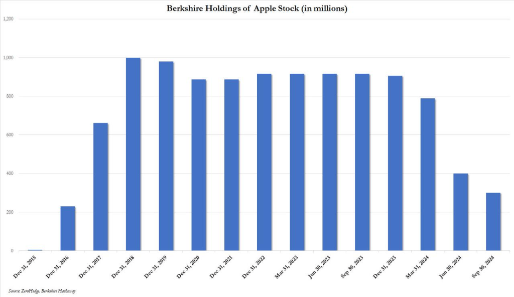 从市值角度,截至9月30日,该公司仅持有699亿美元的苹果股票,低于6月30日的842亿美元,较3月31日的1354亿美元下降62%,较2023年12月31日的1743亿美元下降70%。
