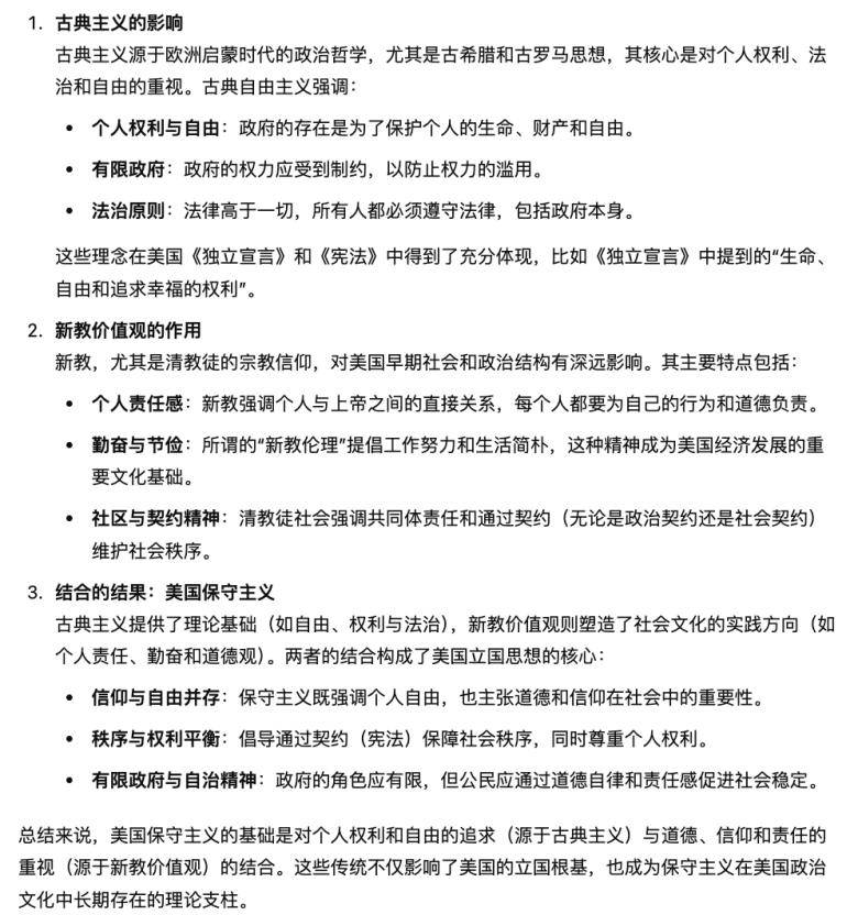 美国保守主义的基础源于古典主义与新教价值观的结合,这些传统曾经构成了美国的立国根基。ChatGPT为我们解释了这句话的深刻内涵: