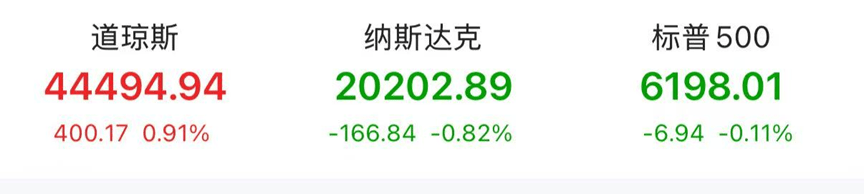 美东时间周二,美股三大指数涨跌不一。截至收盘,道琼斯指数涨0.91%,报44494.94点;标普500指数跌0.11%,报6198.01点;纳斯达克指数跌0.82%,报20202.89点。