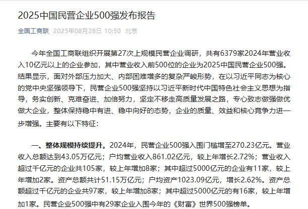 今年全国工商联组织开展第27次上规模民营企业调研,共有6379家2024年营业收入10亿元以上的企业参加,其中营业收入前500位的企业为2025中国民营企业500强。