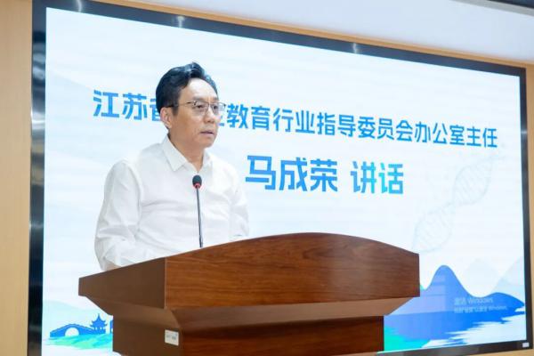江苏省职业教育行业指导委员会办公室主任马成荣在致辞中祝贺行指委成立,并指出大健康产业正迎来黄金发展期。他强调,行指委需精准定位,强化应用研究,突出服务职能,构建教育链与产业链深度融合的良性机制。
