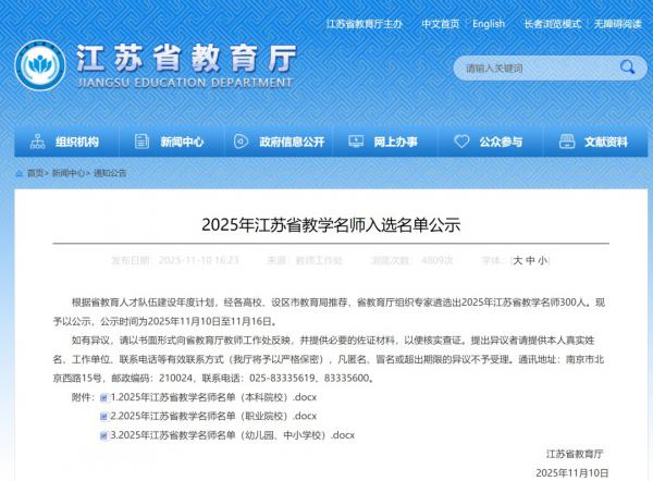 日前,江苏省教育厅发布《2025年江苏省教学名师入选名单公示》,根据省教育人才队伍建设年度计划,经各高校、设区市教育局推荐,省教育厅组织专家遴选出2025年江苏省教学名师300人。