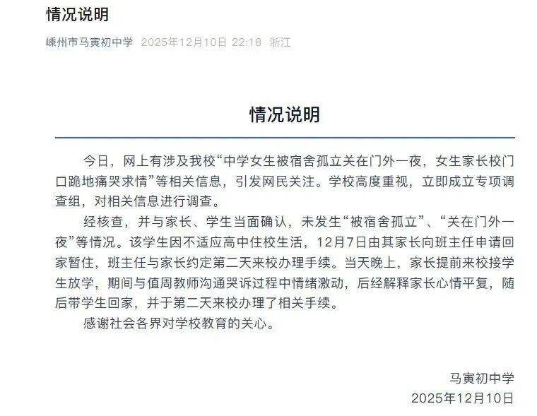 经核查,并与家长、学生当面确认,未发生“被宿舍孤立”“关在门外一夜”等情况。该学生因不适应高中住校生活,12月7日由其家长向班主任申请回家暂住,班主任与家长约定第二天来校办理手续。当天晚上,家长提前来校接学生放学,其间与值周教师沟通哭诉过程中情绪激动,后经解释家长心情平复,随后带学生回家,并于第二天来校办理了相关手续。