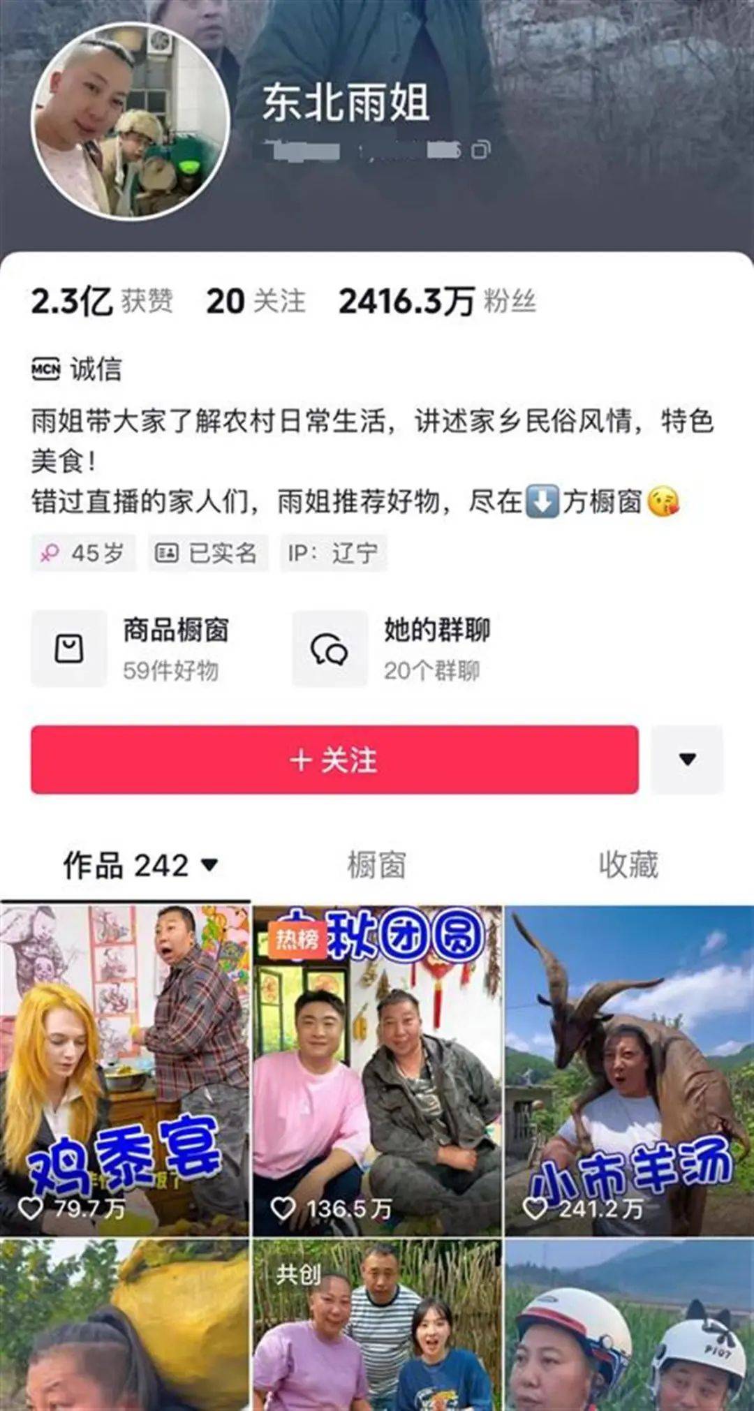 记者在相关平台查询看到,“东北雨姐”主页发布了242个视频,均为分享东北乡村生活,现有粉丝2416.3万人,其带货的商品橱窗中有59件,但没有找到与红薯粉条相关的商品。