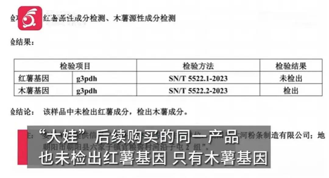 据媒体报道,一位名叫“大娃”的打假博主公开反映,千万粉丝网红“东北雨姐”直播间中售卖的红薯粉条涉假。“大娃”称,他曾三次将购买的红薯粉条送检,但检测报告显示产品未检出红薯基因、只有木薯基因。