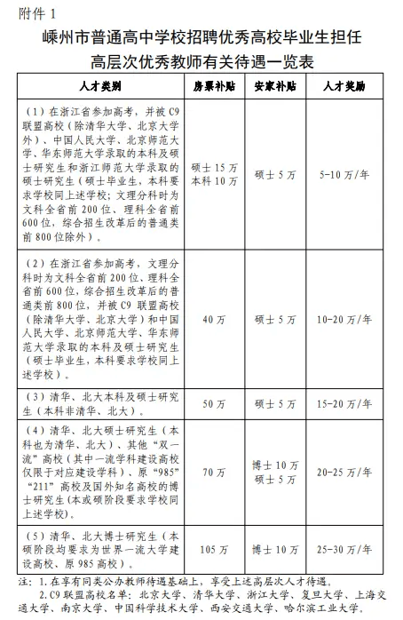 嵊州市普通高中学校招聘优秀高校毕业生担任高层次优秀教师有关待遇一览表