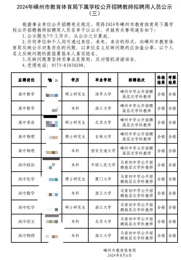 今年8月,浙江绍兴嵊州市教育体育局发布《2024年嵊州市教育体育局下属学校公开招聘教师拟聘用人员公示》,名单显示,拟聘用对象均来自全国排名靠前的顶尖名校。有三名毕业于清华大学和北京大学,四名来自浙江大学,一名来自中国人民大学,一名厦门大学博士研究生,一名吉林大学博士研究生。10月22日,嵊州市教育体育局人事科相关工作人员表示,名单中三名来自清华、北大的毕业生现已入职。