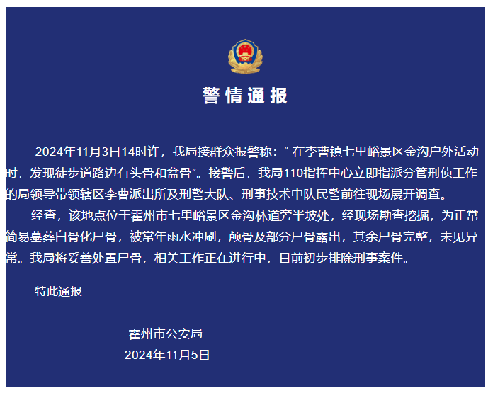 经查,该地点位于霍州市七里峪景区金沟林道旁半坡处,经现场勘查挖掘, 为正常简易墓葬白骨化尸骨,被常年雨水冲刷,颅骨及部分尸骨露出,其余尸骨完整,未见异常。我局将妥善处置尸骨,相关工作正在进行中, 目前初步排除刑事案件。