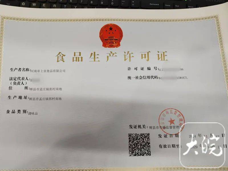11月12日下午,辉县市市场监管局主要负责人也向大皖新闻记者证实,姚江已经拿到证。该负责人介绍,11月12日,核查组报送了核查结果,河南帝上皇食品有限公司经过提升改造后通过核查,该局已经第一时间办结生产许可,并通知当事人前来拿证,得到了当事人的认可。