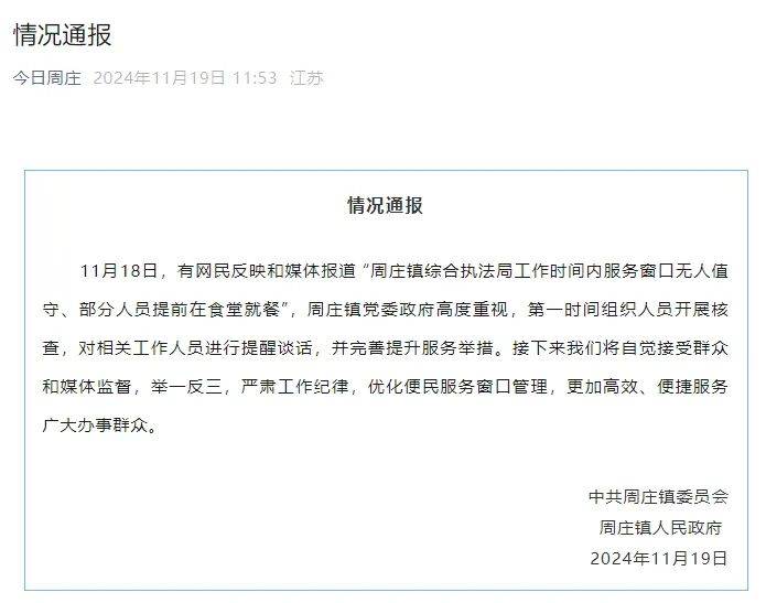 据今日周庄微信公众号消息,11月18日,有网民反映和媒体报道 “周庄镇综合执法局工作时间内服务窗口无人值守、部分人员提前在食堂就餐”,周庄镇党委政府高度重视,第一时间组织人员开展核查,对相关工作人员进行提醒谈话,并完善提升服务举措。接下来我们将自觉接受群众和媒体监督,举一反三,严肃工作纪律,优化便民服务窗口管理,更加高效、便捷服务广大办事群众。