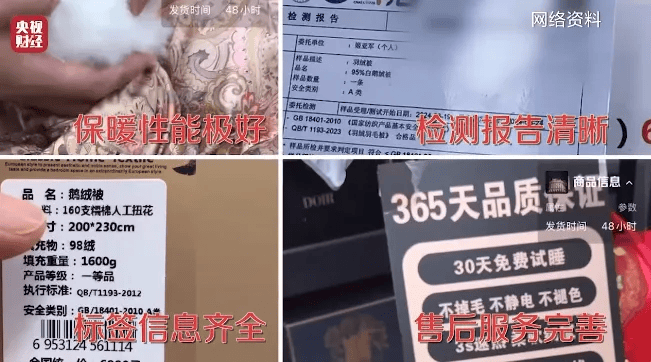直播间内,促销价仅需几百元的羽绒被,被主播们吹得天花乱坠,不仅物美价廉、保暖效果出类拔萃,各种检测报告也十分齐全。