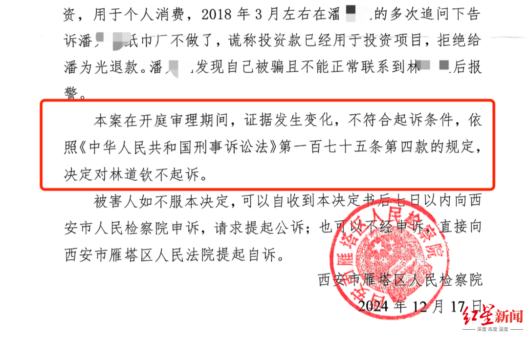 12月17日,雁塔区人民检察院作出不起诉决定书,其中载明:本案在开庭审理期间,证据发生变化,不符合起诉条件,依照《中华人民共和国刑事诉讼法》第一百七十五条第四款的规定,决定对林道钦不起诉。12月18日,林道钦获释。