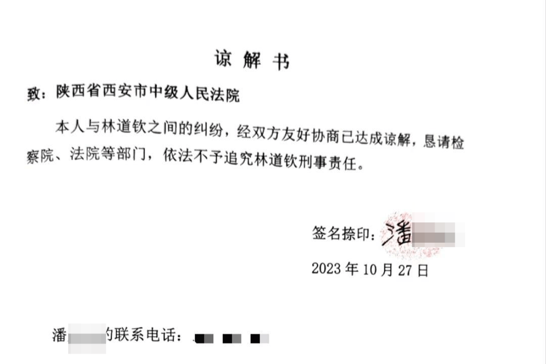 在重审一审再次认定林道钦有罪,林道钦不服判决上诉后,潘某某于2023年10月27日向西安中院出具《谅解书》,其中写道:“本人与林道钦之间的纠纷,经双方友好协商已达成谅解,恳请检察院、法院等部门,依法不予追究林道钦的刑事责任。”同日,潘某某与林道钦之女达成协议,约定由林方汇给其190万元,180万元为退还纸巾项目款,10万元为装修款。银行流水显示,林道钦之女将190万元分四笔转给潘某某。对于出具《谅解书》,潘某某表示,因林道钦被长期关押,体谅其老婆,及孩子快要结婚等情况,才出具谅解书。