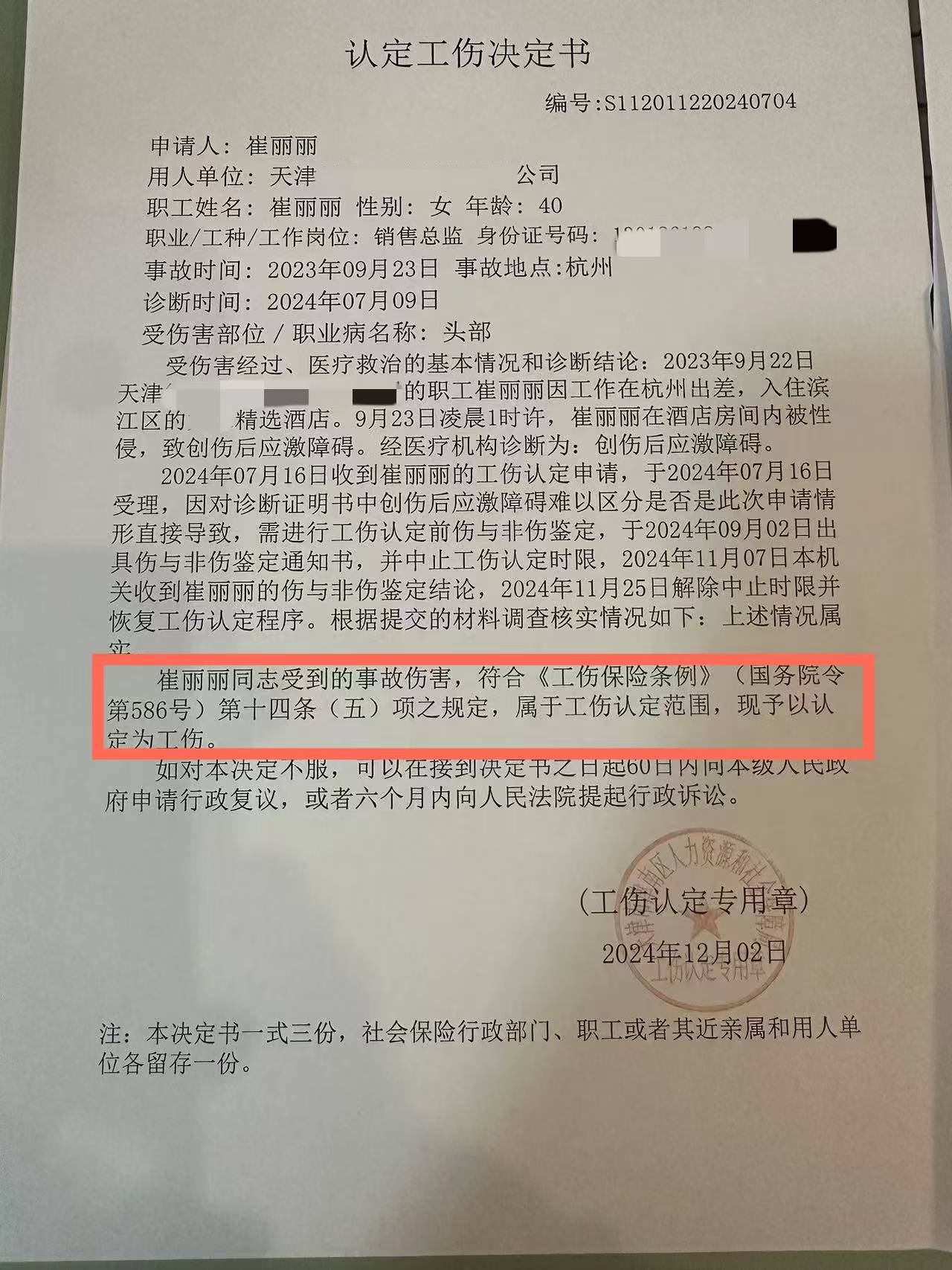 新京报讯(记者赵敏)天津一女子崔丽丽出差时遭职场性侵患创伤后应激障碍,2024年12月,津南区人社局对此认定为工伤。1月21日,新京报记者获悉,崔丽丽就职的公司不服津南区人社局的工伤认定,已提起行政诉讼。