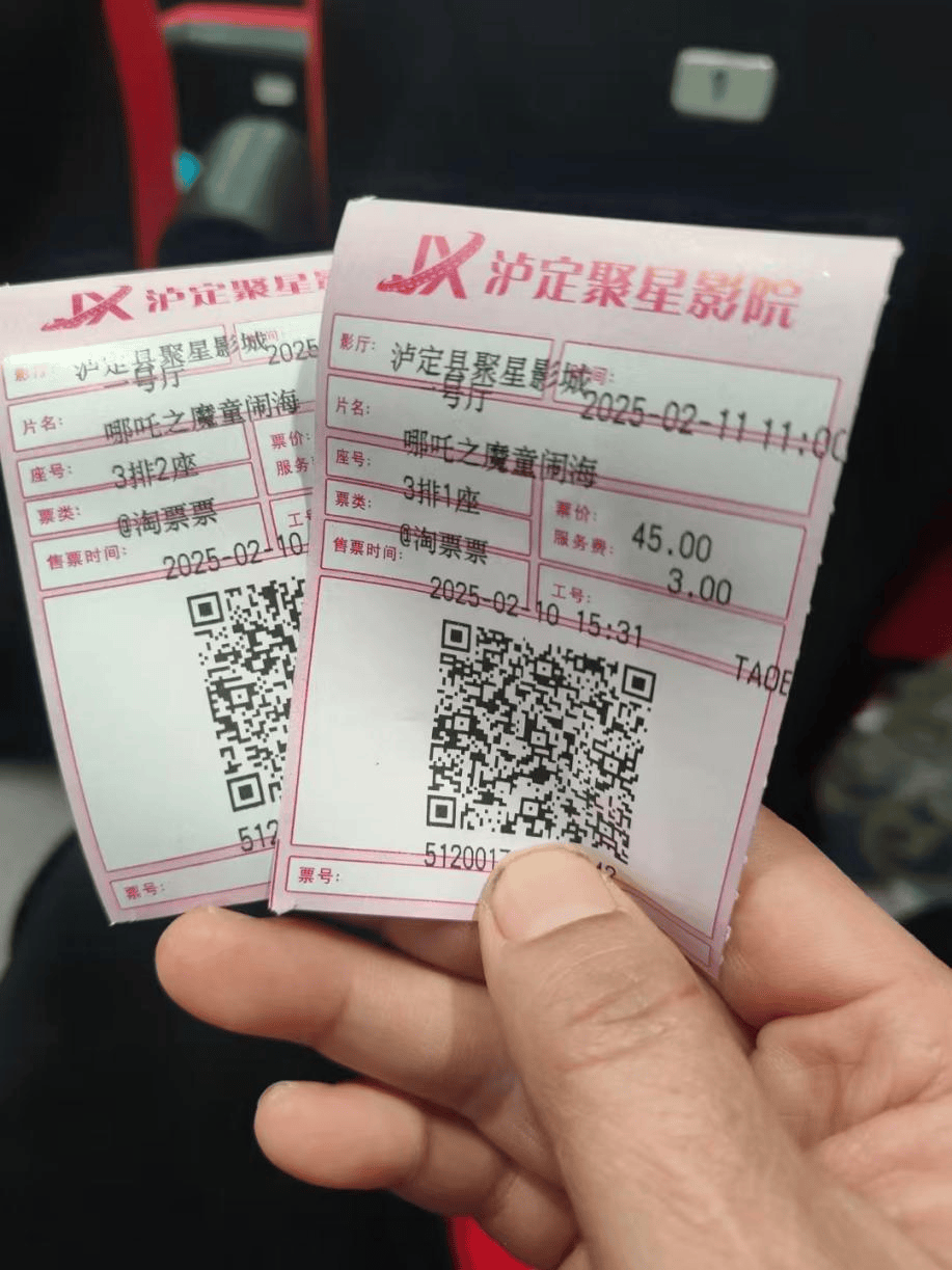 2月10日,李维准备线上购买泸定聚星影院当日放映的《哪吒2》电影票时,发现线上购票链接无法打开,只能线下购买。而自己的一系列遭遇,让她开始质疑电影院存在偷票房。“我现金支付了两张单价48元的电影票,却得到了两张手写了片名、时间、座号等信息的电影票。”