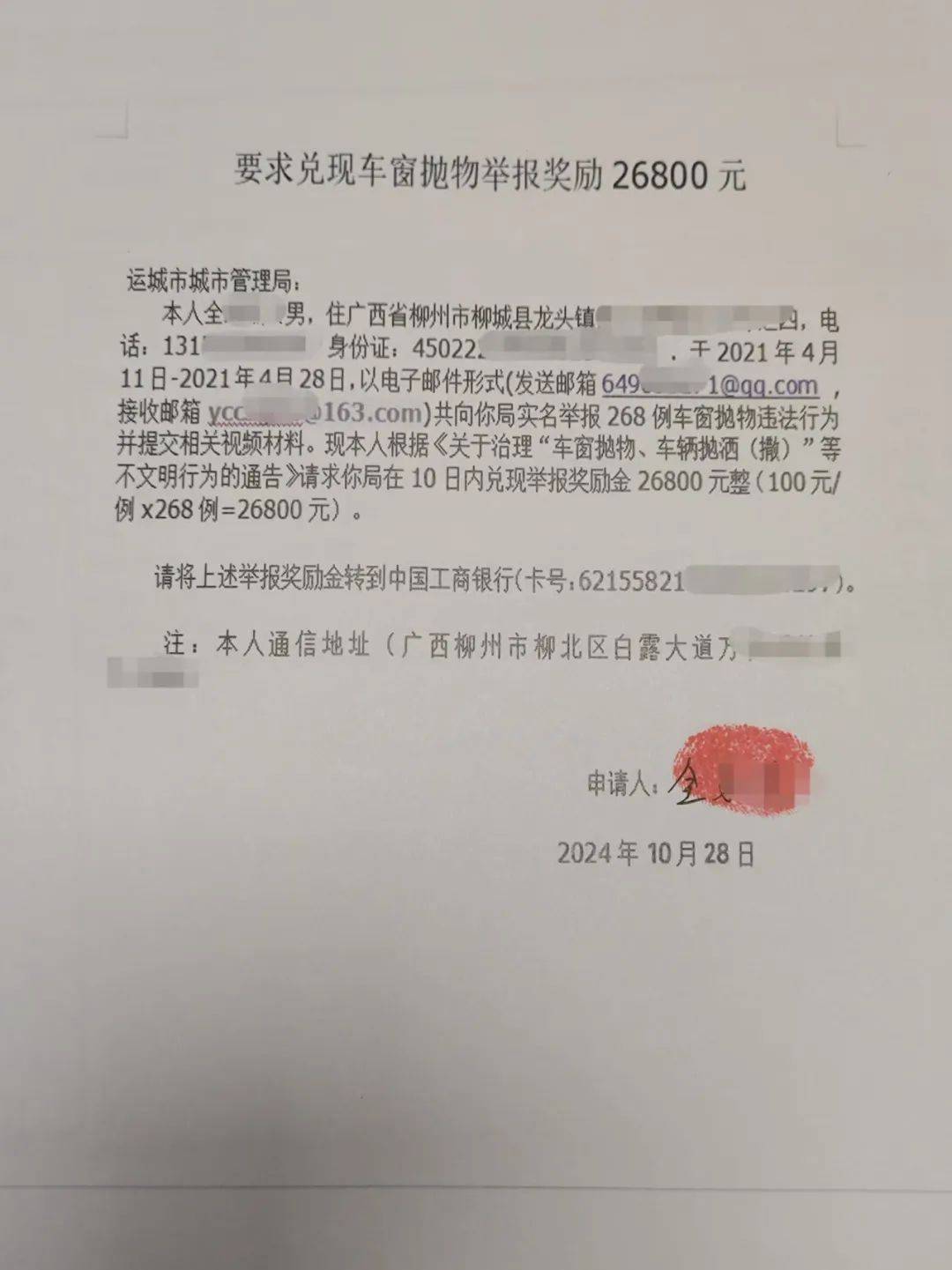 全先生自2021年4月11日至28日期间以电子邮件形式实名举报268例车窗抛物违法行为并提交相关视频材料。按照运城市公布的相应政策,有关部门应兌现奖励26800元(100元/例)。
