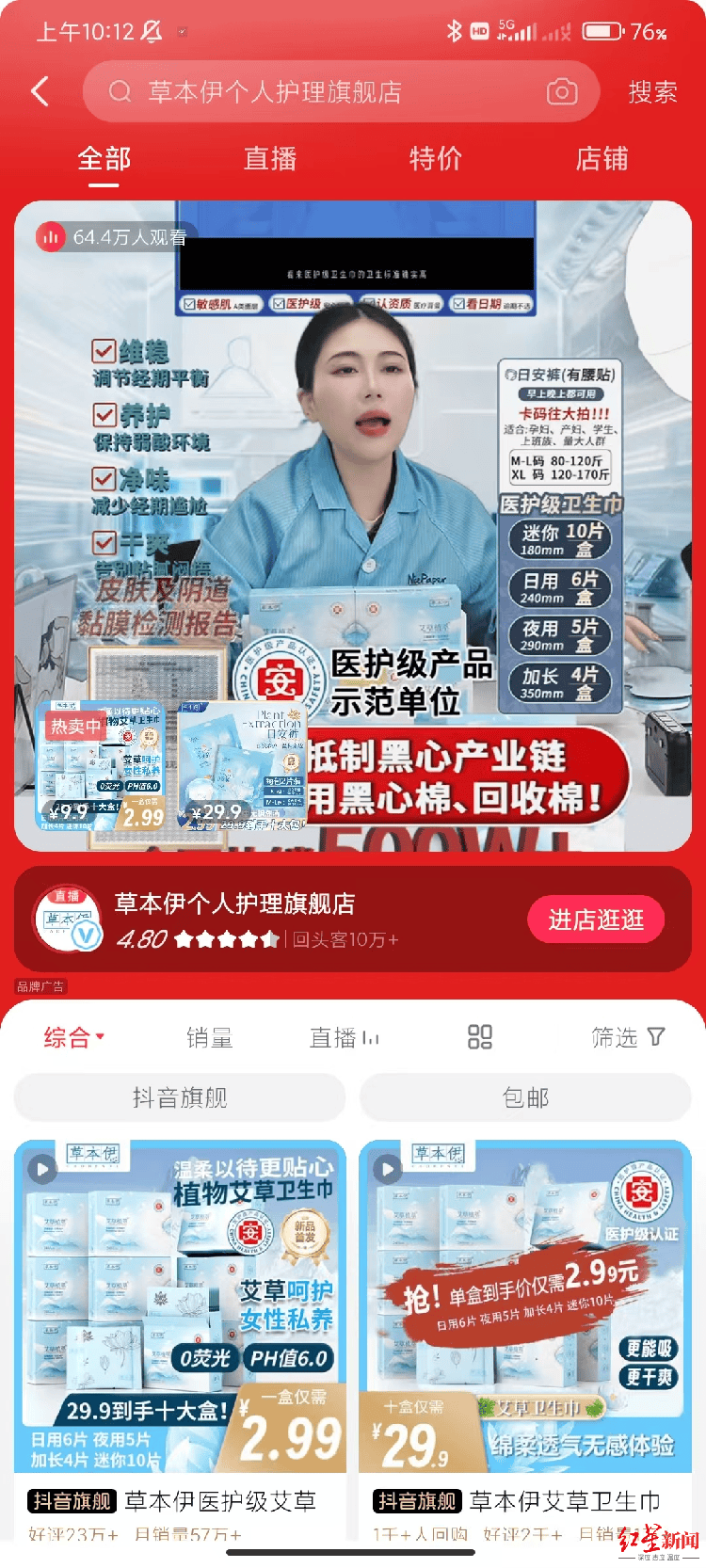 红星新闻搜索发现,杨女士购入有污渍卫生巾的“草本伊个人护理旗舰店”页面显示,商家在抖音平台拥有超54万粉丝,回头客超10万,截至发稿店铺总销量已超526万。在直播页面、商品页面都明显打上“医护级产品”“医护级认证”等标识。