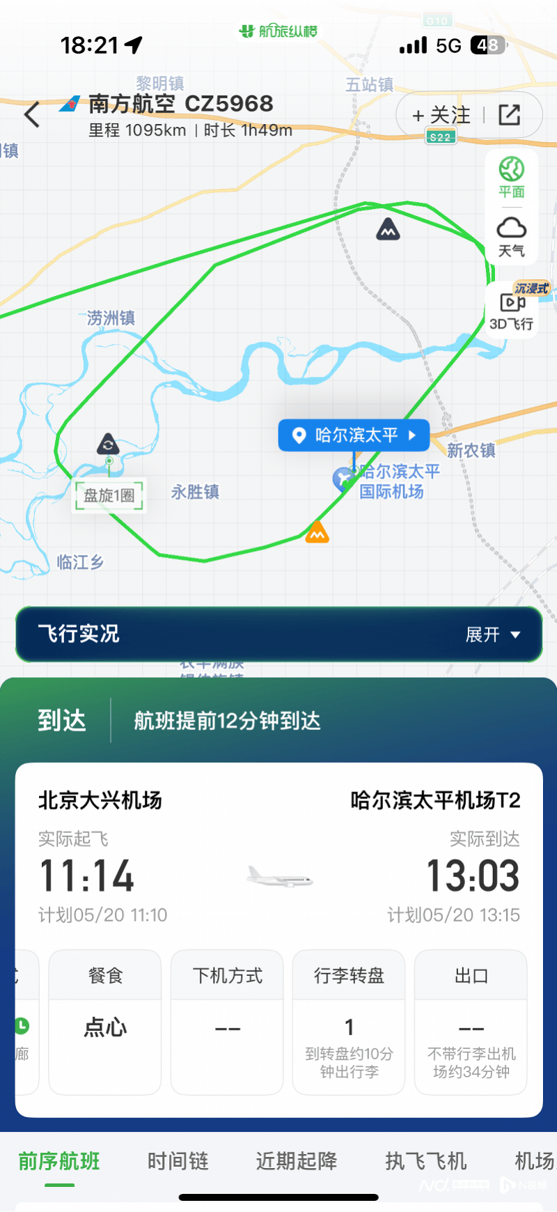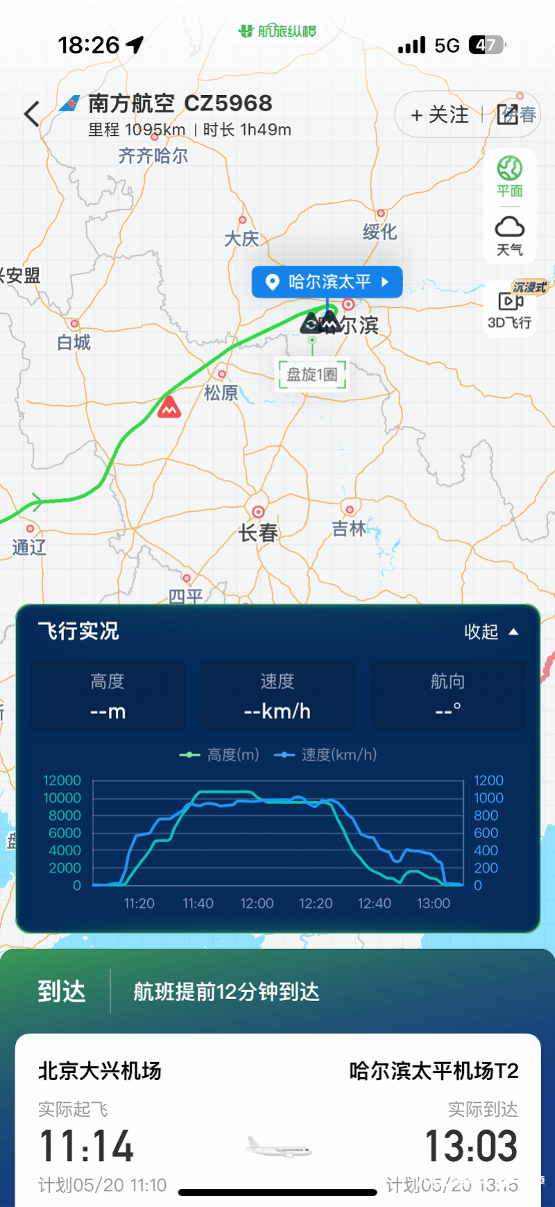 据航旅纵横信息显示,该航班于5月20日11时14分从北京大兴机场起飞,13时03分到达哈尔滨太平机场,比计划还提早了13分钟。第一次降落前发生6次重度颠簸、2次中度颠簸、1次轻度颠簸,触地复飞后发生1次中度颠簸,在机场盘旋1圈。