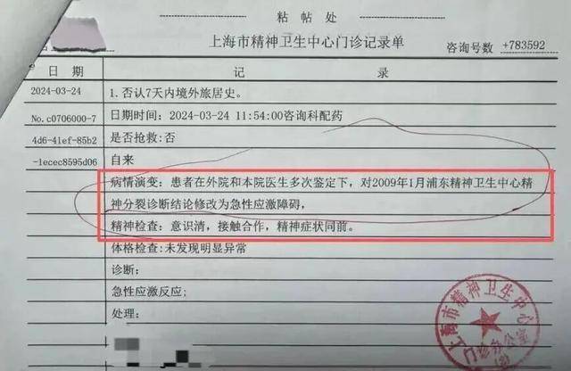 陈先生提供了一份上海市精神卫生中心2024年3月的门诊记录单,其中提到:“患者在外院和本院医生多次鉴定下,对2009年1月浦东精神卫生中心精神分裂诊断结论修改为急性应激障碍。”