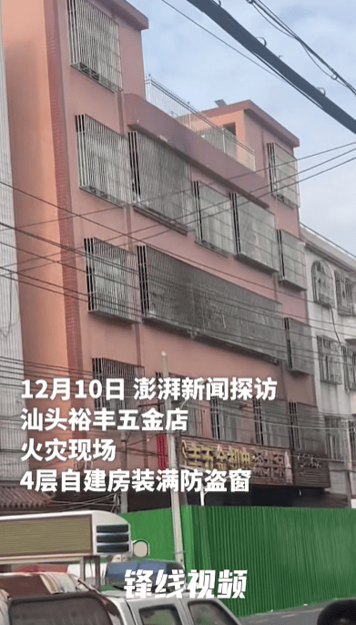 据澎湃新闻,汕头裕丰五金店失火致12人死亡,记者探访现场发现,4层楼均装满防盗窗。幸存家属告诉澎湃新闻,大女儿勇敢独自逃生,妻子带两名孩子靠意志力冲出火海,另3名孩子躲在阳台被消防员救出。