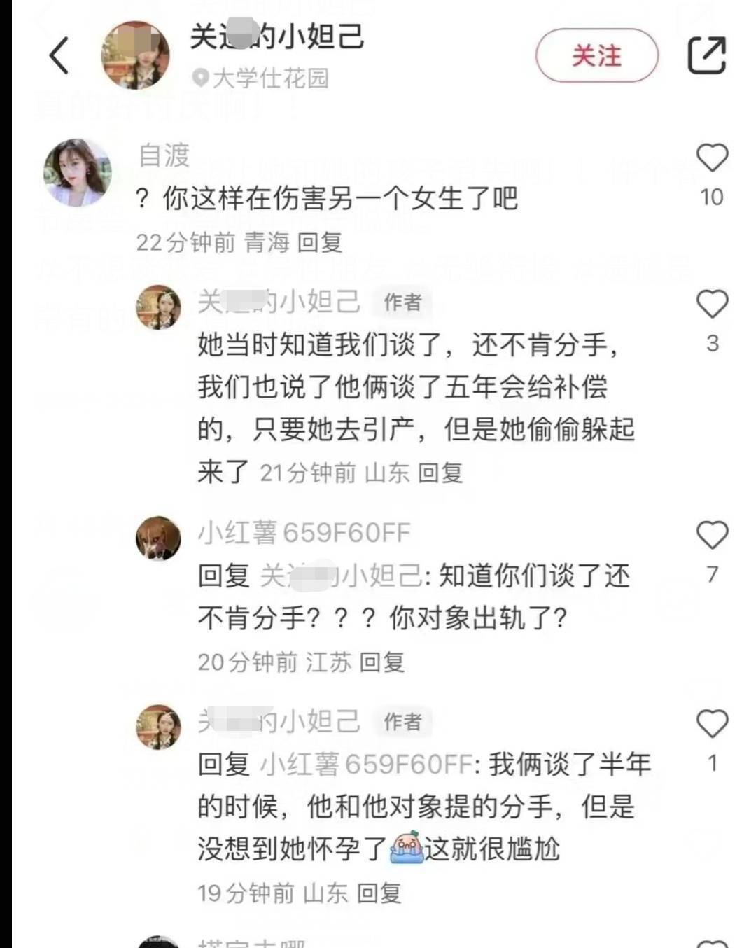 有网友在该动态下留言质疑,“你这样是在伤害另一个女生吧”。该女子回复,“她当时知道我们谈了,还不肯分手,我们也说了他俩谈了五年会给补偿的,只要她去引产,但是她偷偷躲起来了”“我俩谈了半年的时候,他和他对象提的分手,但是没想到她怀孕了”。