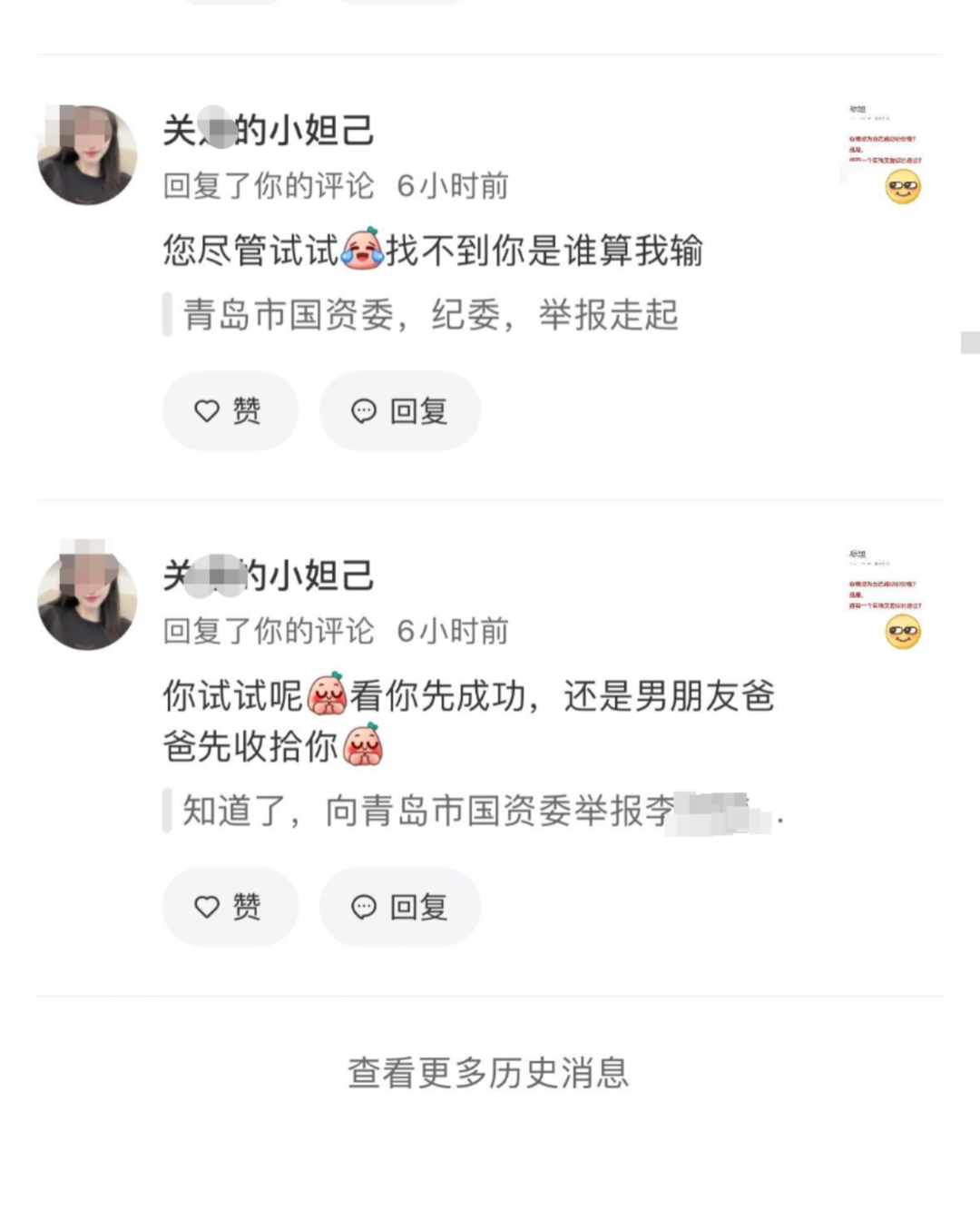 有网友在回复中提出疑问,表示要根据账号信息向青岛国资委、纪委举报,该女子则回复“您尽管试试,找不到你是谁,算我输”“你试试呢,看你先成功,还是男朋友爸爸先收拾你”。