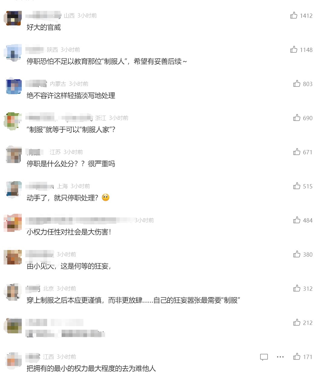 对此,网友们纷纷表示:“好大的官威!”“停职不足以教育他”“小权力任性对社会是大伤害”……