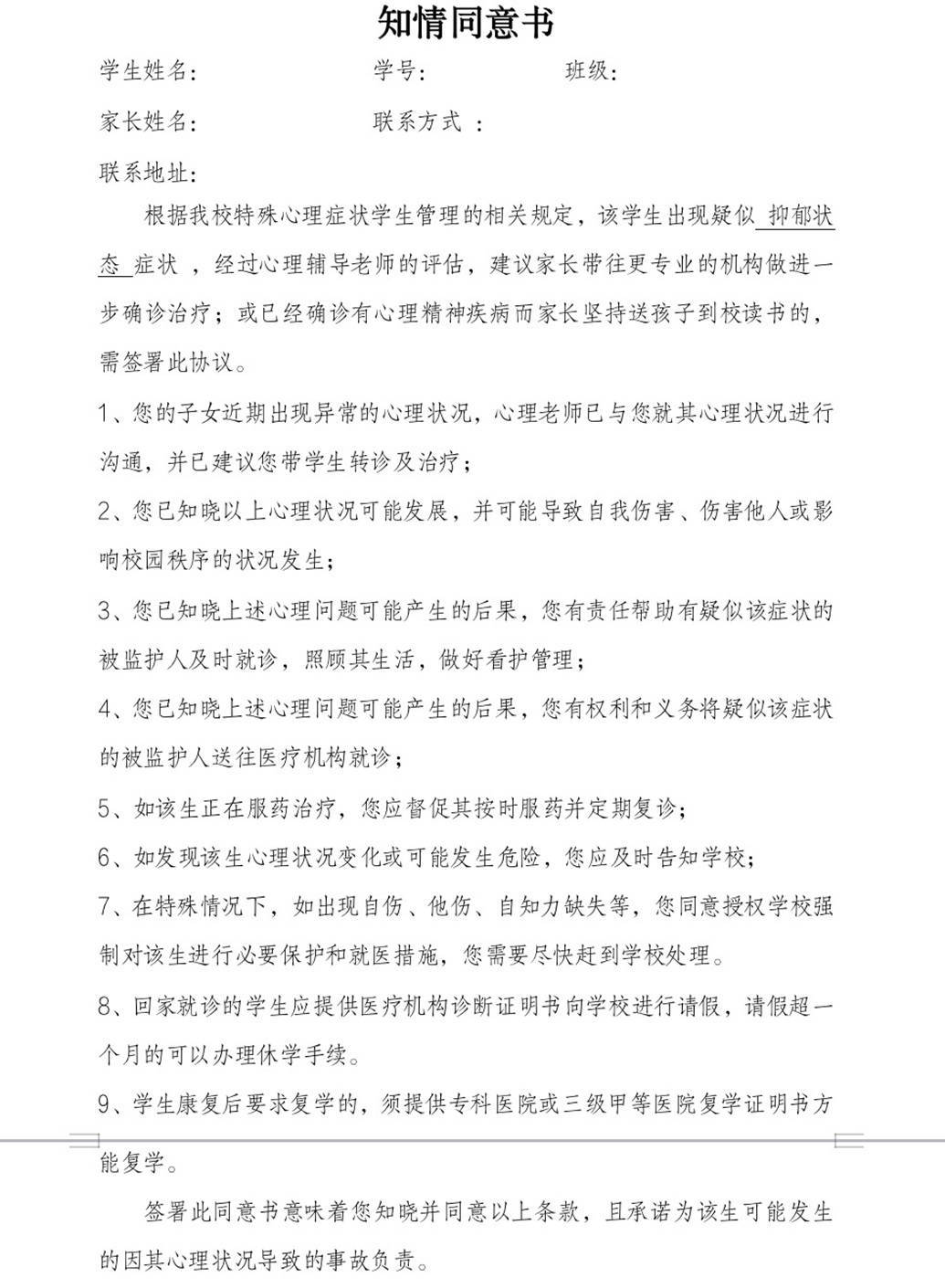 对于《知情同意书》,湛江中医学校表示,父母是未成年子女的监护人,为了学生身体健康及生命安全,当学校发现学生有心理方面的异常表现后,学校有责任和义务将学生的状况及时告知学生家长,所以请家长签署《知情同意书》,告知家长其子女在校的具体情况,提醒家长加以关注学生的心理状况,同意授权学校在特殊情况下对该生进行必要保护和就医措施,配合学校共同加强学生的教育管理。