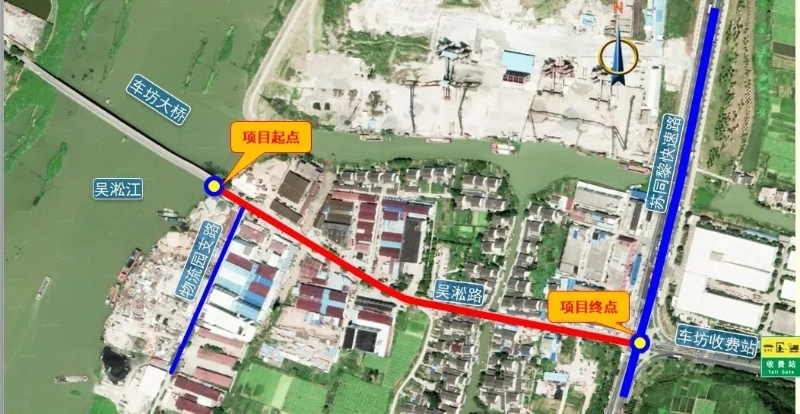 星塘街南延工程 起于苏州工业园区普惠路,主线以桥梁形式向东跨越规划三级航道吴淞江,止于绕城高速车坊互通收费站前。 路线全长2065米,其中园区段1155米,车坊大桥260米,吴中区段650米,桥梁设计为双向6车道。 主线高架桥设计速度为60公里/小时,地面道路设计速度为40公里/小时。该工程于2021年3月31日开工,2023年4月26日通过交工验收。