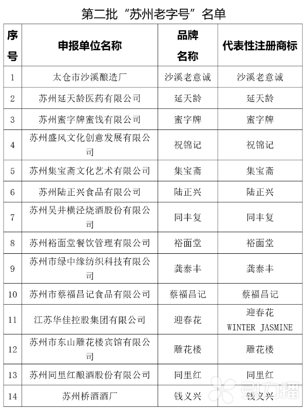 第二批“苏州老字号”分别为太仓市沙溪酿造厂、苏州延天龄医药有限公司、苏州蜜字牌蜜饯有限公司、苏州盛风文化创意发展有限公司、苏州集宝斋文化艺术有限公司、苏州陆正兴食品有限公司、苏州吴井横泾烧酒股份有限公司、苏州裕面堂餐饮管理有限公司、苏州市绿中缘纺织科技有限公司、苏州市蔡福昌记食品有限公司、江苏华佳控股集团有限公司、苏州市东山雕花楼宾馆有限公司、苏州同里红酿酒股份有限公司、苏州桥酒酒厂。