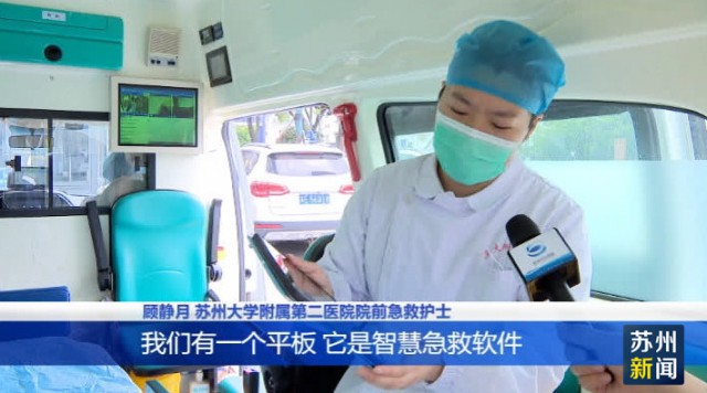 苏州大学附属第二医院院前急救护士顾静月表示,可视频通话,院内可以看到车上大概情况,也可以耳麦对接我们讲话,还有一个身份采集器,刷身份证就能传递个人信息到医院,有一个平板它是智慧急救软件,问了病史之后填上信息,通知医院同时也会把信息传到院内。
