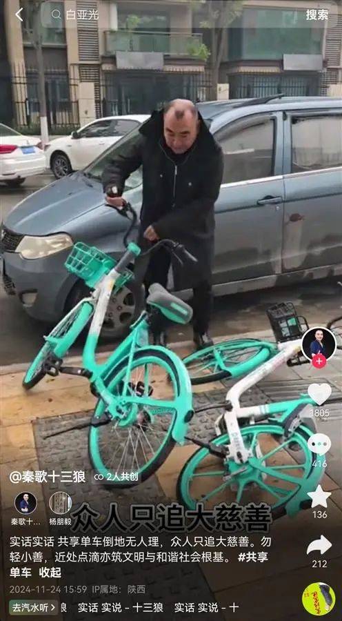 记者注意到,十三狼的社交账号“秦歌十三狼”有17.5万粉丝。11月24日,他曾发布扶起共享单车的视频,并配文:实话实说,共享单车倒地无人理,众人只追大慈善。勿轻小善,近处点滴亦筑文明与和谐社会根基。