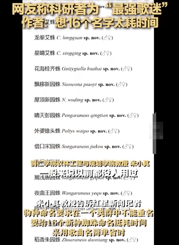 对此该作者表示,物种命名要求在一个类群中不能重名,给16个新种蜘蛛命名挺耗时间,采用歌曲名简单省时,自己平时也很喜欢听周杰伦的歌。